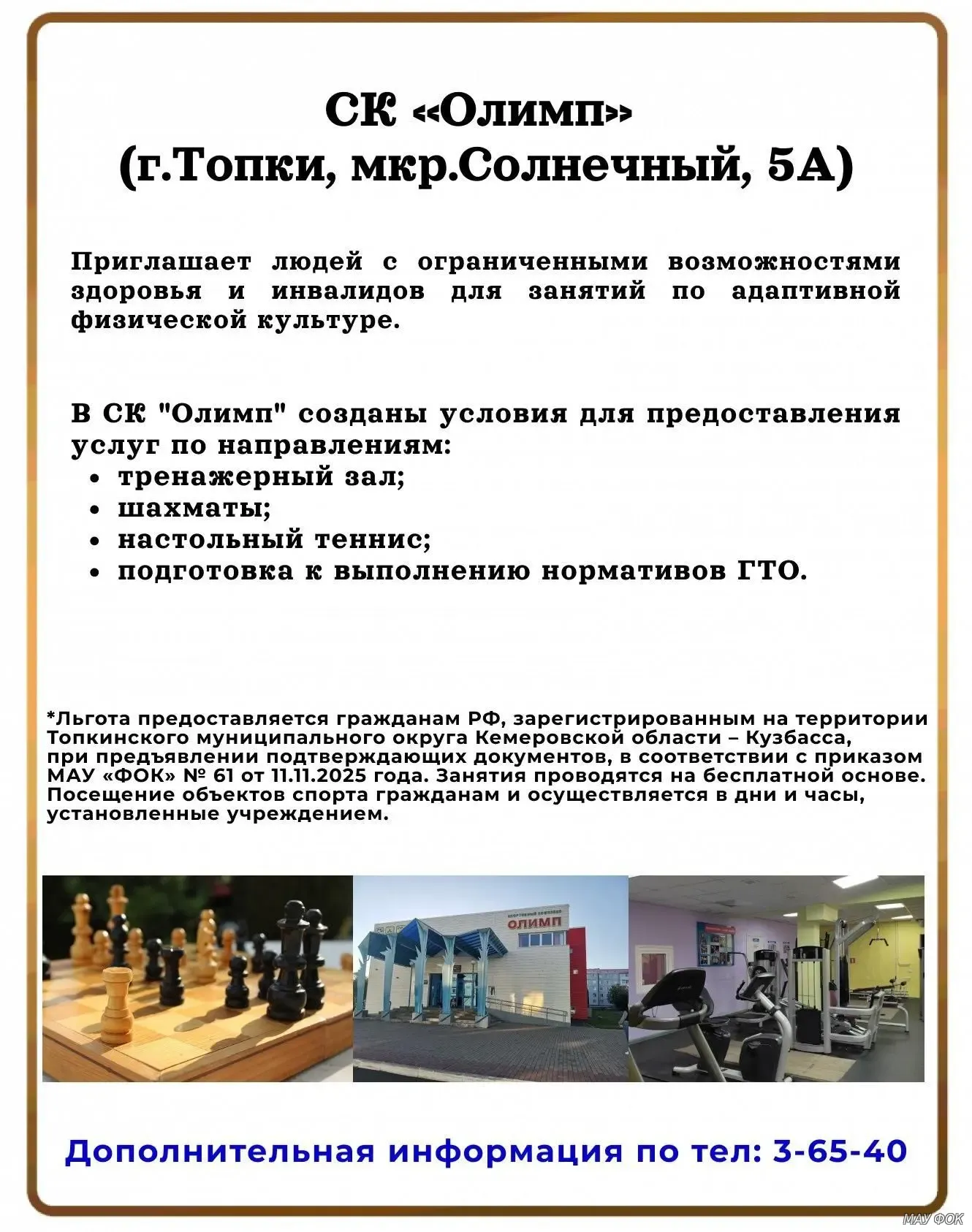 Льгота предоставляется гражданам Российской Федерации, зарегистрированным на территории Топкинского муниципального округа Кемеровской области – Кузбасса, при предъявлении подтверждающих документов, в соответствии с приказом МАУ «ФОК» № 61 от 11.11.2025 года.